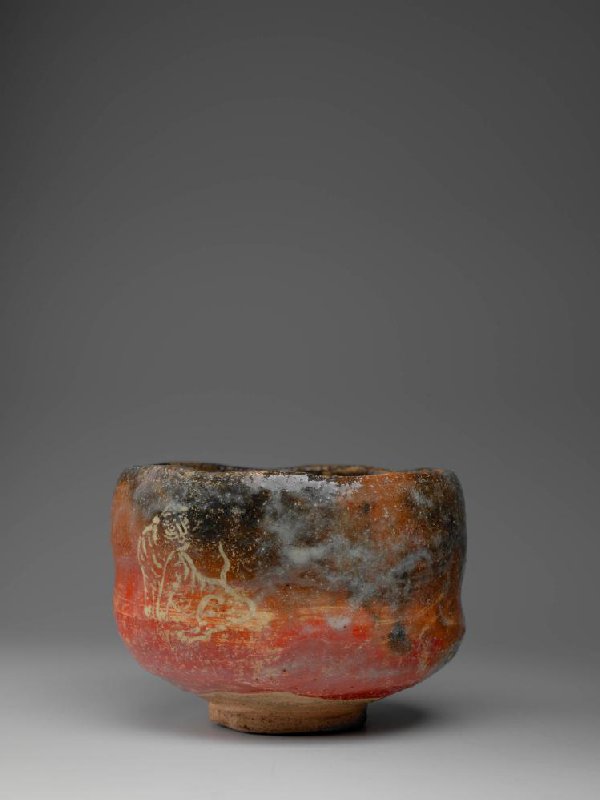 This tea bowl was made by Raku Tannyu, a member of the tenth generation of Raku family potters. Raku pottery is hand-shaped, not thrown on a wheel. It is made of clay mixed with grit. This type of rustic-looking earthenware with cracked and irregular glazes was popular for use in the tea ceremony. The thickness of the bowls kept the tea warm.