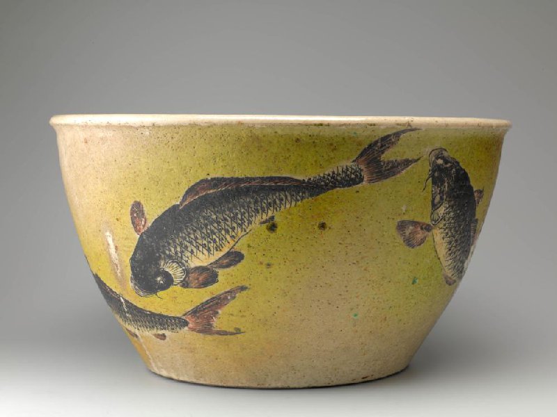 The decoration on this bowl shows carp and other fish swimming in a circle. Its style is similar to that of Japanese prints from the same period: the fish are shown in close-up against a plain, single-colour background.