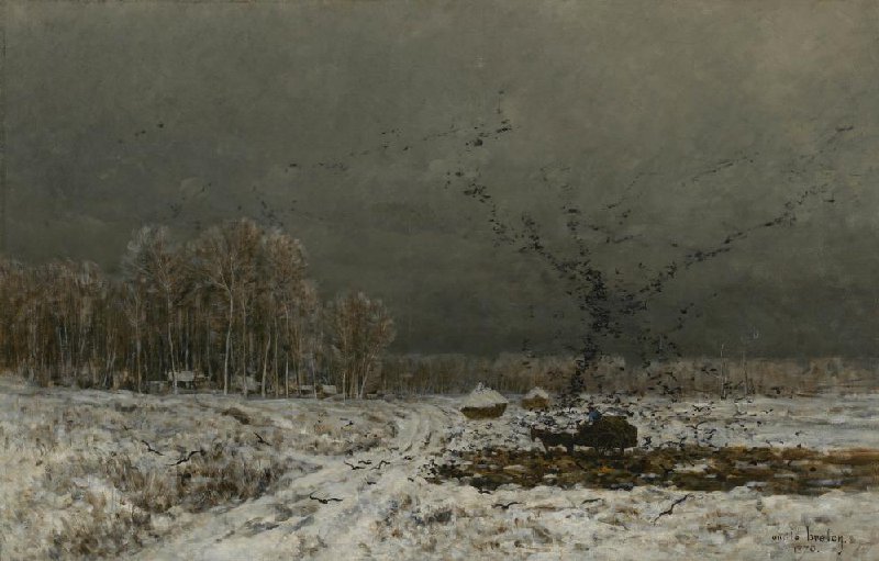 Emile Breton schilderde veel winterse voorstellingen. Dit landschap maakte hij waarschijnlijk in Courrières in Noord-Frankrijk, waar hij zijn hele leven woonde. Hij schilderde een zwerm kraaien die van alle kanten op een mestkar afkomt. De vogels storten zich als in een wervelwind naar beneden. Daarmee bracht Breton beweging in de stille sneeuwvlakte.