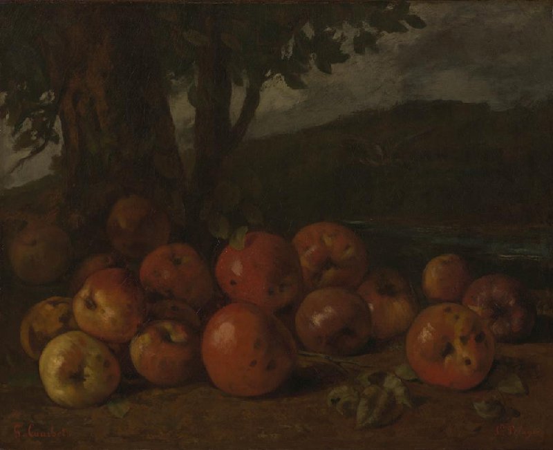 Rechtsonder op dit stilleven met appels schilderde Gustave Courbet de tekst ‘Ste.-Pélagie’. Het was de naam van de gevangenis waar hij vanaf september 1871 een half jaar doorbracht als politieke gevangene. Hij was opgepakt tijdens de Frans-Duitse oorlog van 1870-1871. In de gevangenis klaagde hij dat hij zonder model niet kon schilderen. Daarna mocht zijn zusje Zoé hem vruchten en bloemen brengen, zodat hij stillevens kon maken.