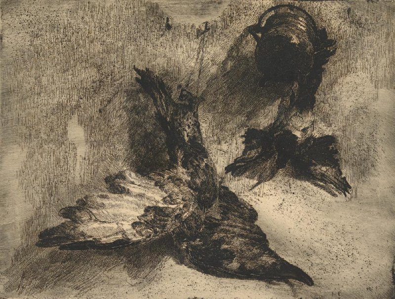 Indrukwekkend is het diepe zwart dat Van Houten in haar etsen wist te bereiken – geen ‘dood zwart maar een levende donkerte’, aldus een kunstcriticus in 1923. Ook in de donkere delen zijn nog steeds de individuele zwarte lijnen zichtbaar die als tastbare draden op het papier lijken te liggen. Soms ging ze over de grenzen van het materiaal waardoor juist vale, lichte plekken ontstonden, zoals in de rechtervleugel van de grote vogel.